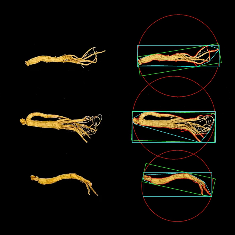 (1) 中藥材形態(tài)解析:基于先進(jìn)視覺算法,在3秒內(nèi)自動(dòng)完成目標(biāo)識(shí)別與分割,精準(zhǔn)解析中藥材輪廓、直徑、長(zhǎng)度、寬度、周長(zhǎng)、顏色、數(shù)量等關(guān)鍵表型性狀。